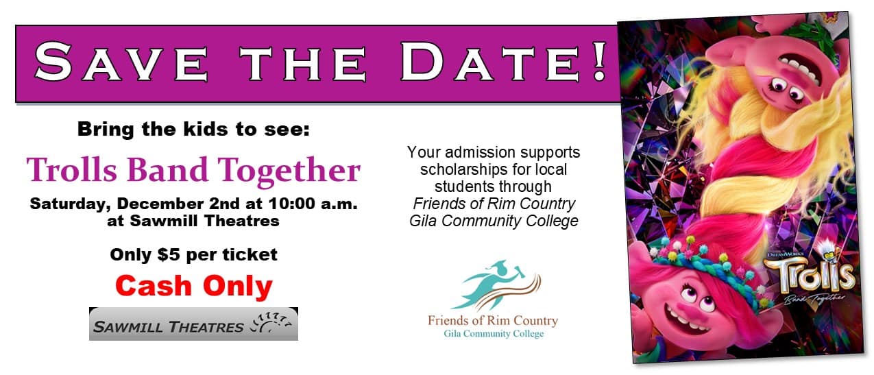 Movie Fundraiser to Support Student Scholarships All Rim Country students are invited to attend the Friends of Rim Country movie fundraiser on December 2nd, 2023 at 10:00 a.m.. All proceeds