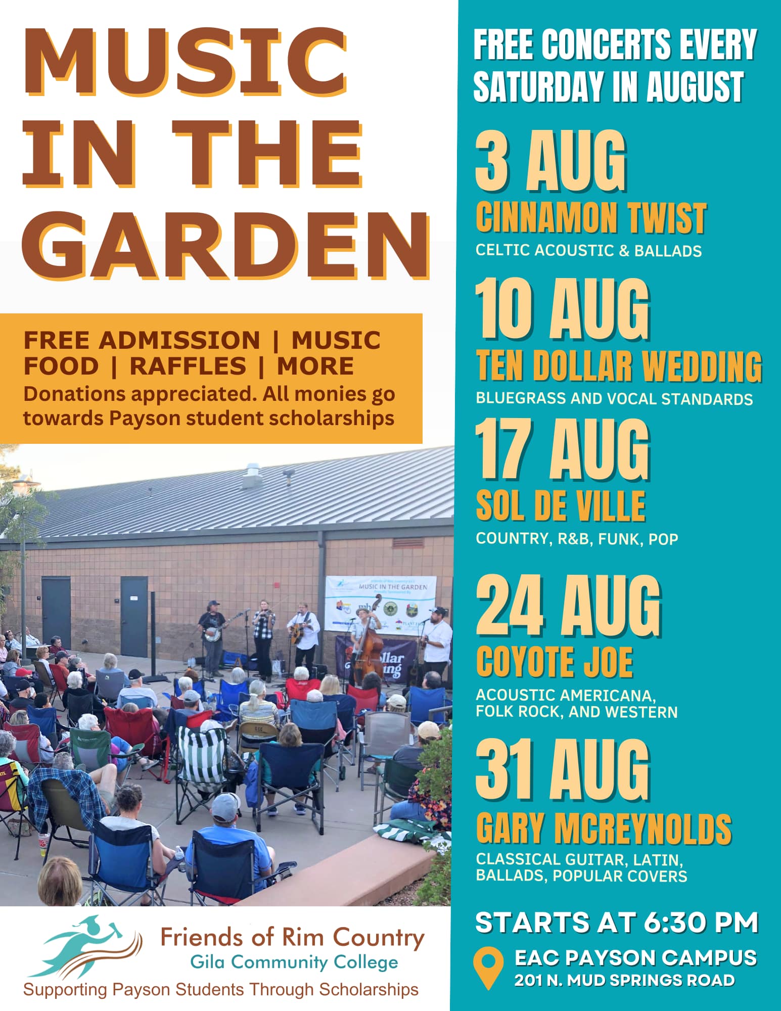 2025 Music in the Garden Free Event in Payson | Fundraiser | Live Music | Gila Community College 2025 Music in the Garden Every Saturday in August Join Us for